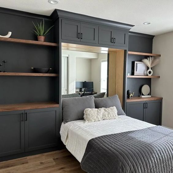 Add a touch of sophistication with a Murphy bed surrounded by elegant cabinetry and bookshelves. This design merges style and practicality seamlessly.