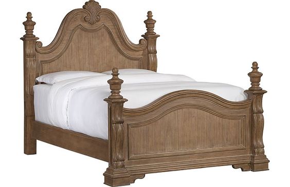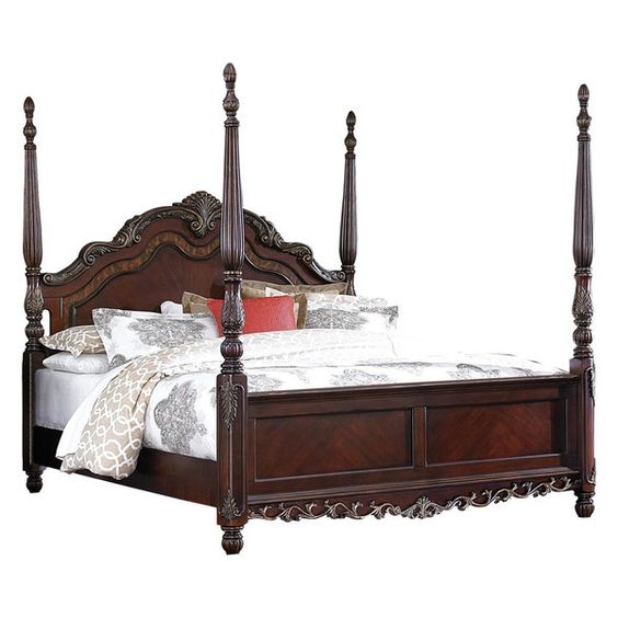 The standout feature of this bed is its four-poster design. The tall, gracefully carved posts exude a sense of grandeur and refinement, reminiscent of classic estate furniture. The detailed craftsmanship extends to the headboard and footboard, showcasing elegant curves and intricate designs that add an extra layer of sophistication.