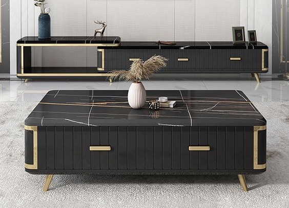 In addition to its sleek design, the TV table is highly practical. It comes equipped with spacious open shelves, allowing you to neatly organize your media components, gaming consoles, or decor pieces. This thoughtful layout helps keep cables tidy and your living room free of clutter. The matching center table complements this functionality with a wide surface that’s perfect for everything from magazines and coffee cups to decorative items.