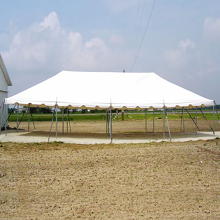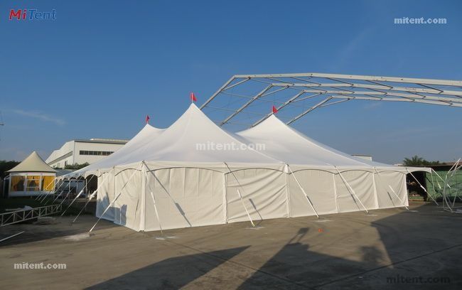 Peg and pole tents use center poles and external pegs for support, offering more dramatic height and better wind resistance for large outdoor events